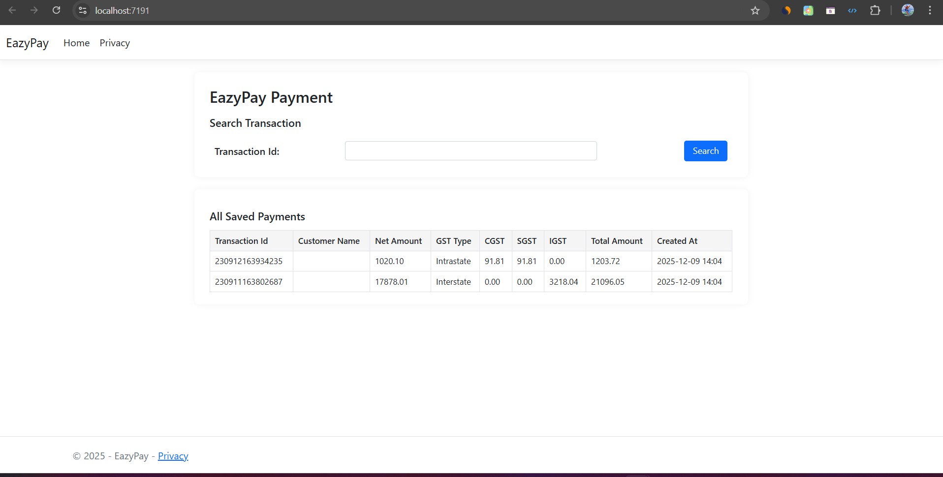 - Stored data includes Transaction ID, Merchant ID, Net Amount, GST details, total amount, and status