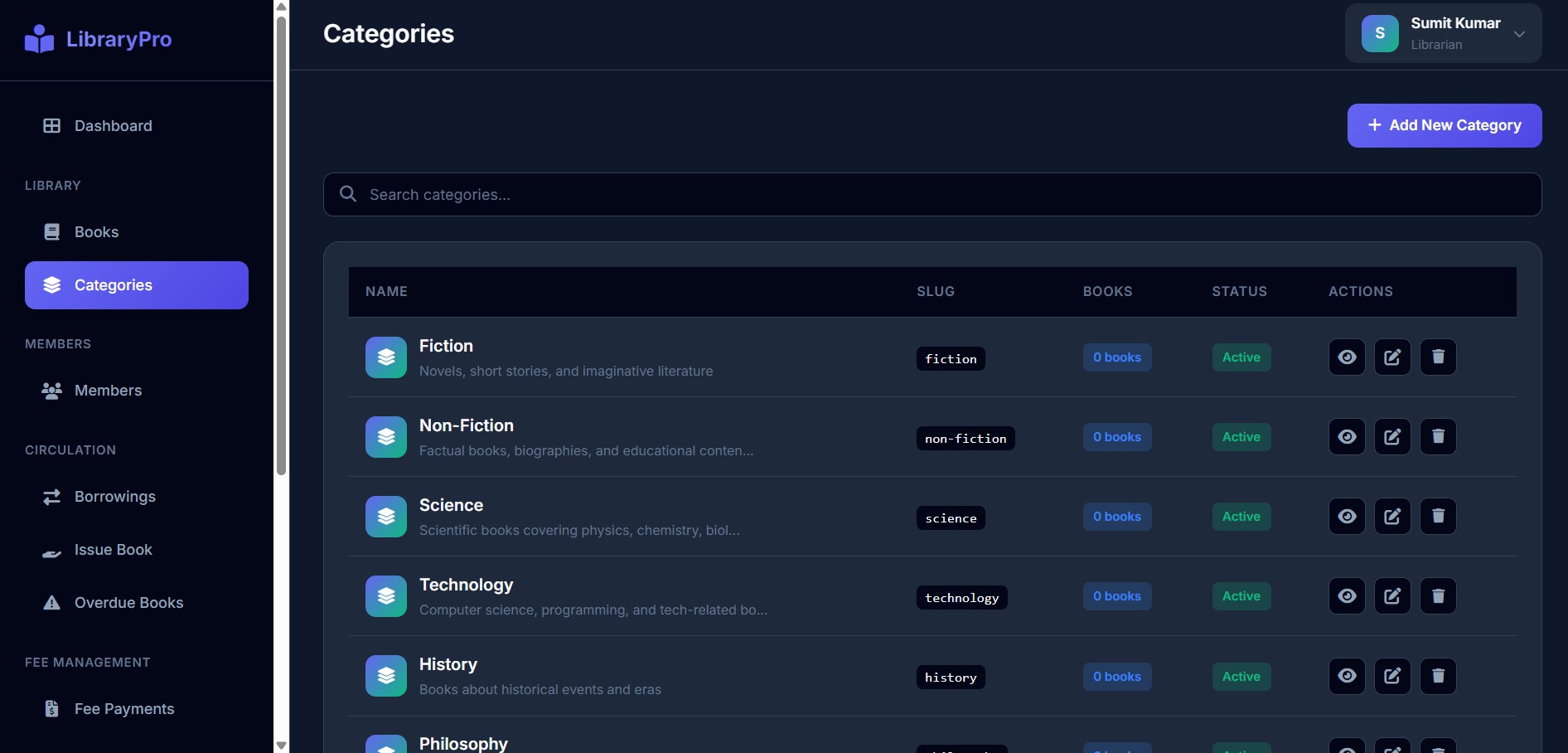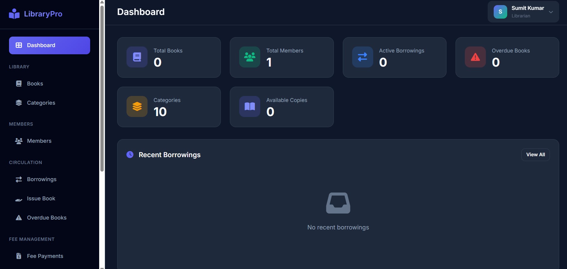Admin dashboard displays total books, issued books, available books, and user activity at a glance.